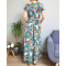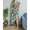 Robe longue asymétrique verte fleurs et feuillages multicolores